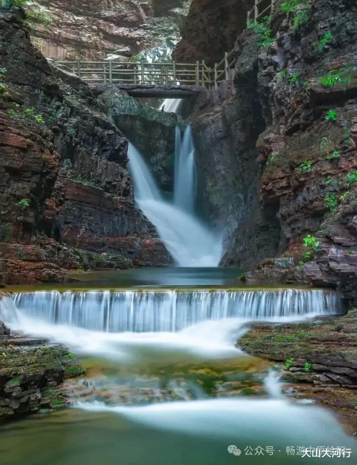 走进红石峡,仿佛闯入了另一个世界。丹红色的峭壁层层叠叠,曲折蜿蜒的峡谷里,溪水清澈得能看见水底的鹅卵石,130米落差的飞瀑从悬崖顶端奔涌而下,砸在潭里溅起细碎的水花,凉丝丝的水汽扑在脸上,连夏天的燥热都被浇灭了。别看峡谷号称只有500米,可上上下下走完全程得花两个小时——一会儿要走贴着峭壁的栈道,一会儿要跨过小溪上的石板,一会儿又要抬头看头顶仅容一线的天空,每一步都是新鲜的体验。尤其是阳光透过缝隙洒进峡谷时,红色的岩石被染得发亮,溪水泛着粼粼的光,美得像一幅会动的油画。